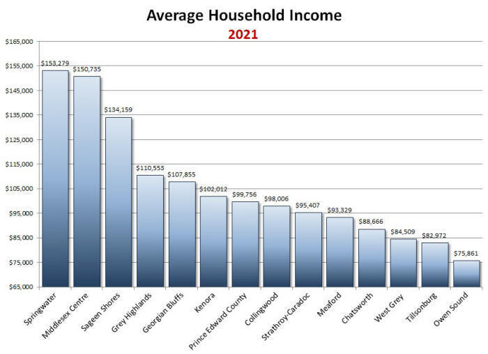 The graph above shows the average household incomes, in 2021, for a few similarly sized municipalities as well as our neighbours next door. You can easily see that incomes in Owen Sound are significantly lower than the similarly sized municipalities. Surprisingly household incomes are also much lower than Georgian Bluffs and Meaford. This really means that Owen Sound residents are the least able to absorb tax increases. Unfortunately, as we saw before, we are already the highest taxed community in Southern Ontario and things are getting worse. Collingwood is not shown because it was not included in the 2021 BMA data for this category.