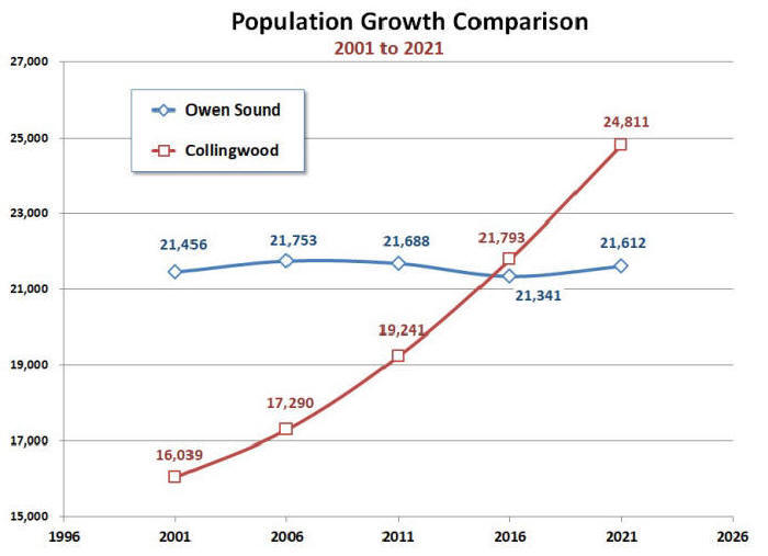 The census is taken every five years and the results are available on the Statistics Canada website which makes if very easy for anyone to access. The first thing that we notice when we compare populations, is that in 2001 Owen Sound’s population was actually 5,417 residents greater than Collingwood; but 20 years later in 2021, Collingwood was 3,199 residents greater than Owen Sound. During this period Collingwood grew by 54.69%, while Owen Sound grew by less than one percent - 0.73%.
