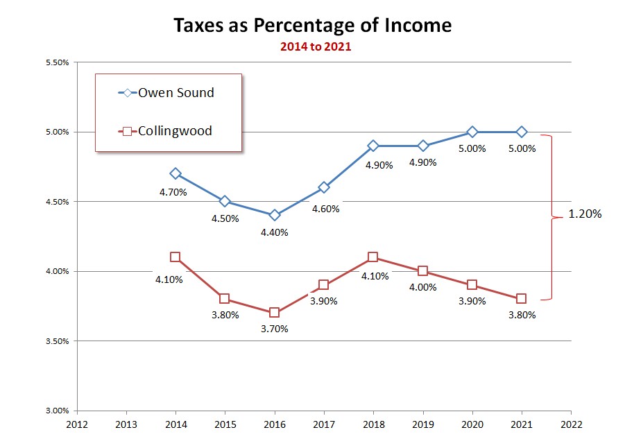 To really understand what this means for Owen Sound residents we will now look at what percentage of our incomes that we have to spend on taxes compared to Collingwood.