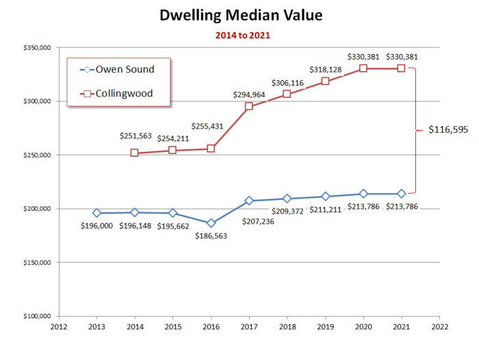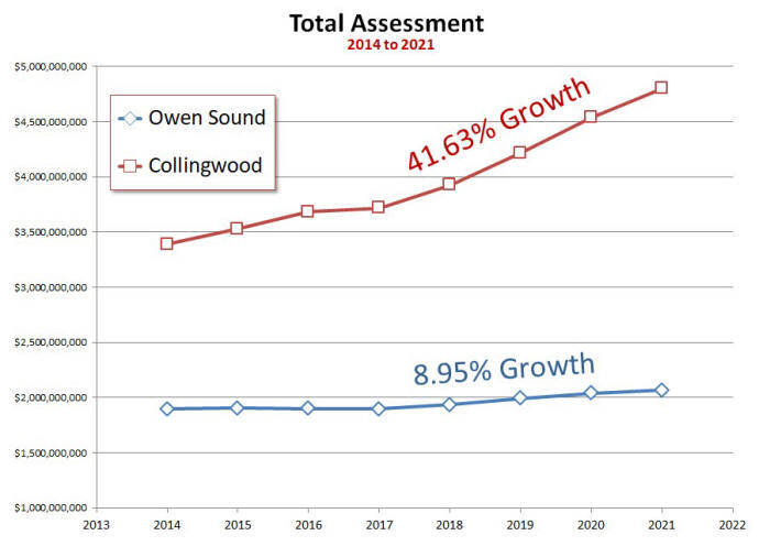 and 2021. Owen Sound’s assessment has grown by only 8.95% while Collingwood’s