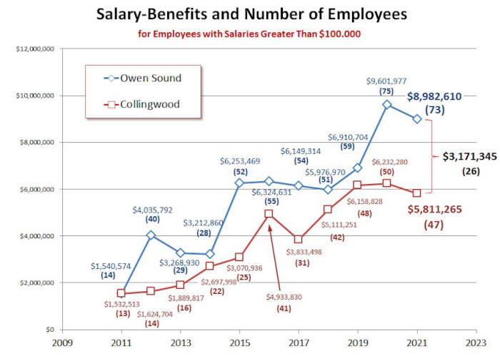 Owen Sound had 73 employees in 2021 receiving salaries greater than $100,000 for