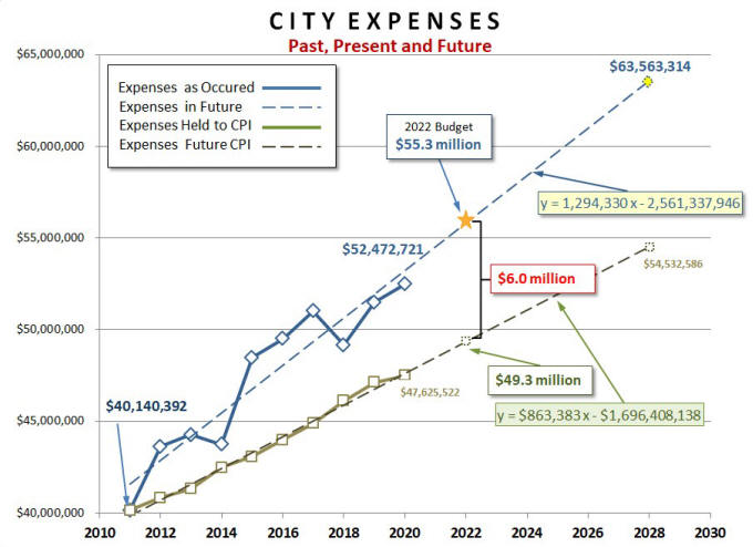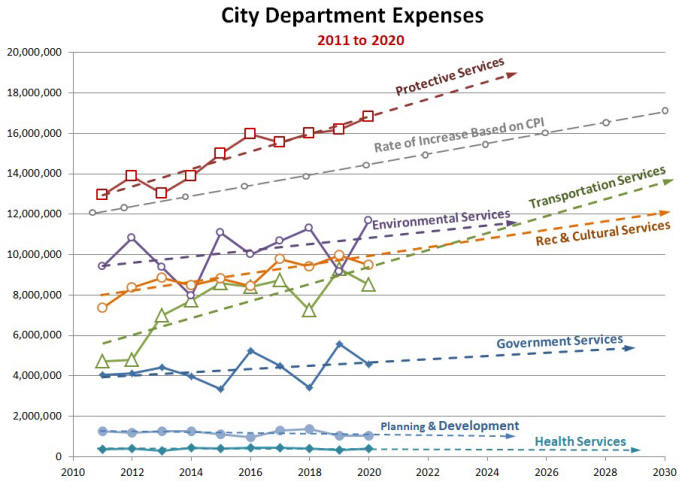 City expenses increased by $12.3 million or 30.7% between 2011 and 2020. This was well beyond the 18.3% increase in the Consumer Price Index (CPI) for the same period. As shown in this graph below, the increase in expenses followed a relatively linear path during the study period. The linear projection of expenses, shown as dashed lines, into the future shows that expenses have been increasing steadily at a rate of nearly $1.29 million per year. If Council continues on this path, expenses are projected to reach $63.5 million in the next 6 years. This represents an increase of $23.5 million from the $40.1 million they were in 2011
