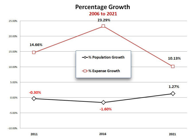 It is unreasonable to expect expenses to have been frozen at the 2006 level just because our population didn't grow. As we all know, the cost of products and services go up a little every year. It would have been reasonable for city expenses to grow at the same rate as inflation. Had the annual increases in expenses been capped at inflation, the total expenses in 2021 would have been $48.5 million instead of the $54.5 million that actually occurred. That puts the excessive growth in expenses to be in the order of $6.0 million for the period 2006 to 2021. Approximately, 76% of this would have affected the total tax levy which also includes a portion going to the County. That’s a difference of about $4.5 million in the tax levy. A generous approximation is that $350,000 represents a one percent increase in the tax levy. So had the city held the annual increase in expenses to inflation over the past 11 years, the tax levy would be approximately 13% or $4.2 million less than the $32.5 million that it is today.