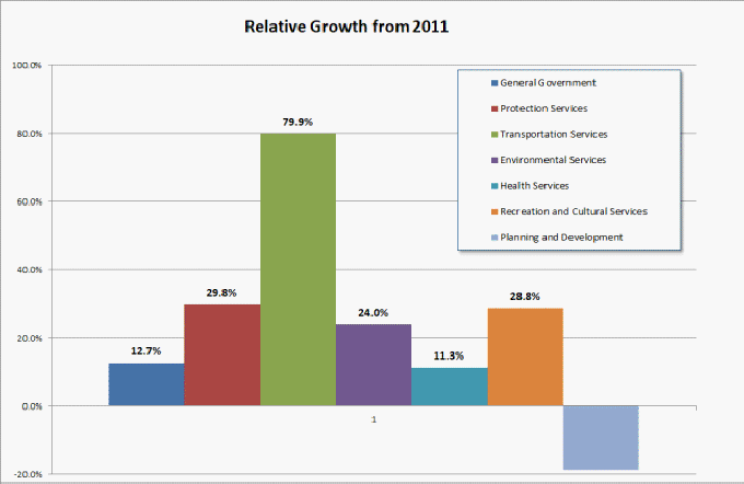 In addition to Transportation and Protective Services there are two other areas whose growth exceeded the CPI growth of 18.3%. They are Recreational and Cultural Services at 29% and Environmental Services at 24%.