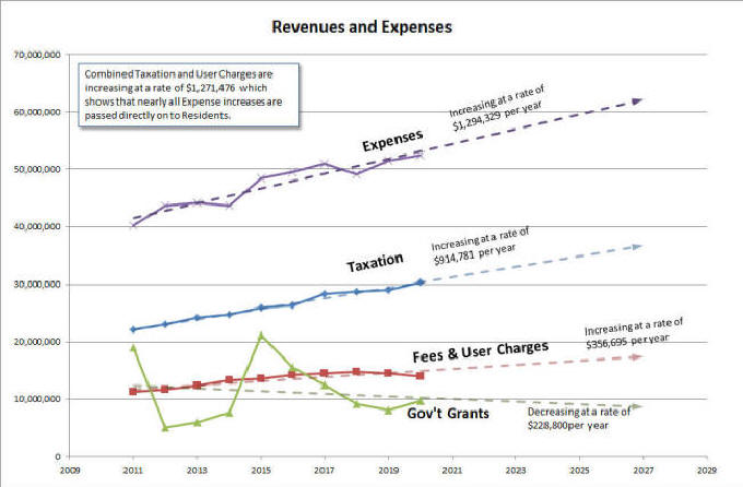 It is also interesting to note, although revenue from government grants is steadily decreasing, at a rate of $228,800 per year, it does not account for the steady increases in Taxes. Even when government grants were at an all-time high, taxes were still being increased by Council. It would seem that taxes are arbitrarily increasing every year independent of government grants.