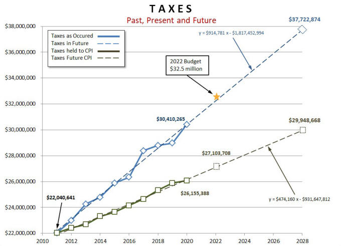 If, in 2011, Council had directed that all future tax increases be limited to inflation, then revenue from taxation in 2020 would have been $26,155.388 or $4.3 million less than what actually occurred as shown by the green line in Figure 1. When we project this into the future it gets even more dramatic. If inflation continues at the same rate and if tax increases had been capped at CPI in 2011, then taxes would reach $29,948,668 by 2028 which is actually $2.5 million less than what they are today.