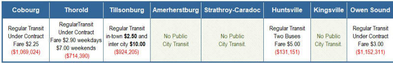 In regard to bus fare costs Cobourg had the lowest fare costs in 2021 at $2.25 followed closely by Tillsonburg at $2.50, Thorold at $2.90 and Owen Sound at $3.00. Of note is that Thorold has a special weekend fare that is significantly higher than the weekday fare at $7.00 per ride. Perhaps this is something Owen Sound should consider.